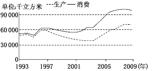 材料三? 1993—2009年中国原木生产量、消费量变化曲线图。