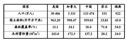 材料二?五个国家的人口、面积、森林覆盖率和木材蓄积量(2009年)。