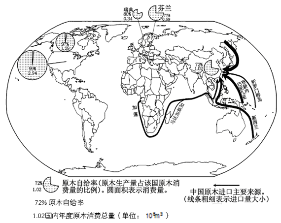 (1)原木自给率最高的国家是 ?? ;中国原木进口最大来源国的森林类型主要是 ?? 林 (4分)