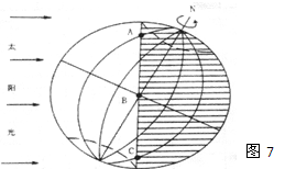 (3)如果此时北京时间为10点,A点的经度为 ,C点的经度为 。(2分)