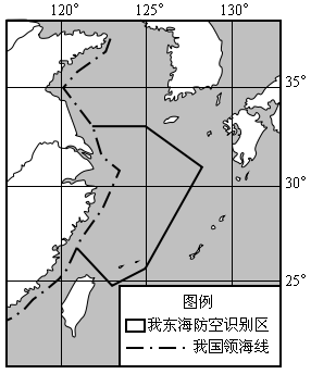 5、单选题 2013年11月23日,中华人民共和国政府宣布划设东海防空识别区(如下图所示)。具体范围为以下六点连线与我领海线之间空域范围:33º11´N 、121º47´E, 33º11´N、125º00´E, 31º00´N、128º20´E, 25º38´N、125º00´E, 24º45´N、123º00´E, 26º44´N、120º58´E。我国的钓鱼岛及其附属岛屿等均属于防空识别区的范围。读图完成各题。