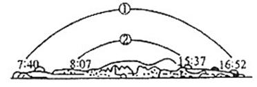 1、单选题 下图为我国①②两地某日日出日落(北京时间)示意图,读图回答下列问题。