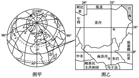 (3)比例尺大的地图反映的内容详细,表示的范围小,甲、乙两幅图相比较,比例尺较大的是图乙;由图可以看出②地和③地两地纬度相差60,也就是两地的实际距离为60 x 111km,若图甲中②地和③地的图上距离为2.22厘米,则图甲的比例尺约为2.22/60 x 111=1∶300 000 000。