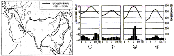 1、综合题 下图为“1271 - 1295年马可·波罗东行路线示意图”和“气温曲线降水柱状图”,读图回答下列问题。(12分)