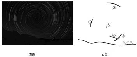 4、单选题 2014年的第一场流星雨出现在1月4日,左图为某观测者在我国某地通过长时间曝光(捕捉流星)拍摄的一张照片;右图为示意图,图中能显示流星和照片曝光时间分别为??