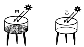 3、单选题 某校学生中午做下图的实验:将甲、乙两个规格与质量相同的玻璃箱同时放在日光下,甲箱底部放有沙土,1小时后同时测玻璃箱里的气温,结果是甲箱内的气温比乙箱内的气温高。据此完成下列各题。
