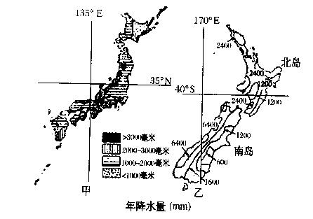 (2)请比较图中甲、乙两国年降水量分布特点及其形成原因。(6分)