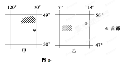 2、单选题  图8中经纬网表示甲、乙两个发达国家的主要区域范围,阴影部分分别为两国著名的工业区。据此完成问题。