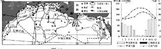 (1)甲乙两地气温和降水的差异是???????????。试从气压带、风带的移动规律分析产生上述诧异的原因 ????????????(6分)