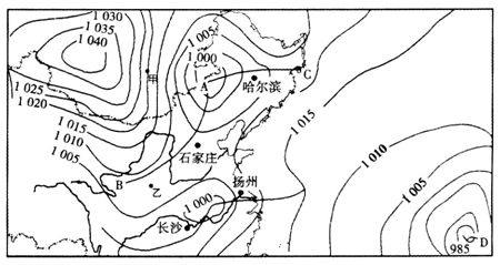 (1)读图,根据气压值判断锋面气旋的位置,根据冷锋降水在锋后,暖锋降水在锋前,判断扬州、长沙可能以阴雨天气为主。哈尔滨、石家庄是晴朗天气。