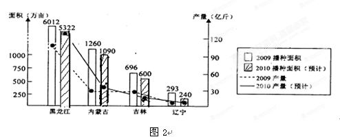 2、单选题  我国大豆主要分布于东北地区,但近几年的播种面积和产量都不稳定,下图为2010-2011年四省区大豆种收情况统计图,读图2完成问题。