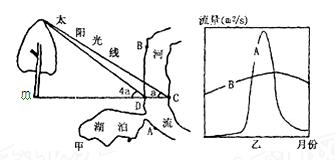 2、单选题 下图甲中MC、MD分别为树木一年正午投影最长和最短时的影长,它们与河流AB段正好垂直,图中C所在河岸比 BD岸冲刷严重,图乙中两曲线A、 B分别代表图甲中 A、 B两处测得的河流全年流量曲线,据此回答19—21题。