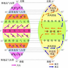 形成洋流的主要动力是盛行风,其他的影响因素有地转偏向力和陆地轮廓。依据气压带、风带的分布,可以分析出A项是正确的(下图)。B项中气压带的位置正确,风向东西方向反了。海陆间水循环主要环节:海洋水-蒸发-水汽输送-降水-地表水-地表、地下径流汇入大海。④中太阳的位置应该偏向右侧,右侧地球的位置是冬至日,地球公转至近日点附近。