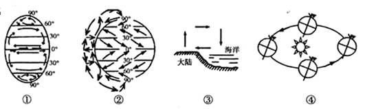 5、单选题 下列四幅图分别表示世界洋流模式图、三圈环流模式图、海陆间水循环示意图和地球公转 运动示意图,正确的是