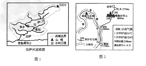 材料一:拉萨河流域图(图1)及墨脱公路图(图2)
