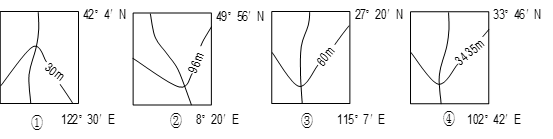 本题解析:试题分析:凌汛形成需要两大基本条件:一是河流有冰期;二是河流自较低纬度向较高纬度流,故根据河流流向与等高线的关系:河流流向与等高线的凸向相反。结合选项中四地的经纬度位置判断,①位于我国东北地区,但河流自较高纬度向较低纬度流,不符合;②位于欧洲西部,受温带海洋性气候影响,河流无冰期,不符合;③位于我国南方地区,冬季无冰期,不符合;④位于我国青藏高原的东部边缘,地势高,气候寒冷,冬季有冰期,且河流自较低纬度流向较高纬度,故可能形成凌汛。