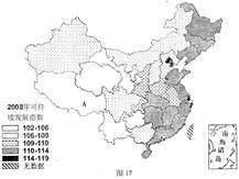 材料二:图17反映我国2008年各省(自治区、直辖市)可持续发展能力指数。(1995年全国平均水平为100)