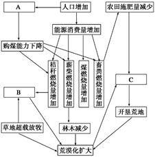 5、综合题 该图是“我国西部某地区人口、生活能源、荒漠化关联图”,读图回答下列问题。