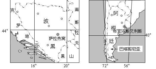 (1)由气候资料图可以看出:萨拉热窝地处内陆,大陆性较强;夏季气温不高凉爽,冬季近于0℃寒冷;年温差大;年降水量较小,不足1000mm;但降水各月较均匀。布宜洛斯艾利斯在南半球,地处沿海,受海洋影响明显;夏季高温多雨,冬季温和少雨,降水季节变化大;年较差小。