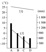 C、 D地1月气温最低主要原因是纬度高、海拔高。
