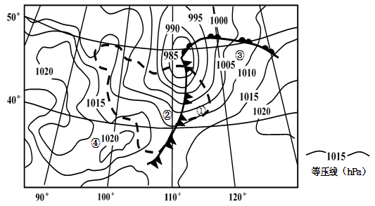 【小题2】图示虚线范围大部分位于冷锋过境后的地区,该地区受单一冷气团控制,气温低,降水少,风力强,可能形成沙尘暴。