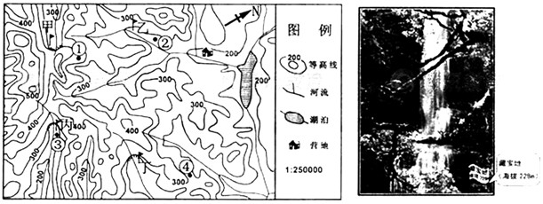 1、单选题 某次地理夏令营活动的主办者策划了一次“寻宝”活动。在活动前,每位营员均会获得一张地图(左图)和一张幕布照片(下图)。据此回答下列问题。