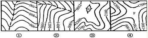 本题解析:本题考查等高线地形图的判读。等高线的分布可以反映地表形态。闭合等高线中间高四周低为山顶,中间低四周高为盆地;等高线弯曲可以利用口诀“凸高为低,凸低为高”帮助记忆山谷和山脊。凸低为山脊,为分水岭,凸高为山谷,可能发育有河流,河流流向低处;等高线相交处的地形为陡崖。所以图中①为山谷、②为山谷、 ③为山顶、④为鞍部。所以本题选择B选项。