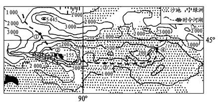 小题2:由经纬度和等高线分布特点可判断该区域为我国的吐鲁番盆地和哈密盆地,②地附近为绿洲,应种植葡萄等温带水果;该地区河流补给类型主要为冰雪融水,夏季气温高,冰雪融化量大,河流易涨水,而国庆期间温度较低,不会出现涨水;③地附近线路,与等高线大致平行,地形起伏小。