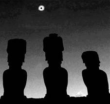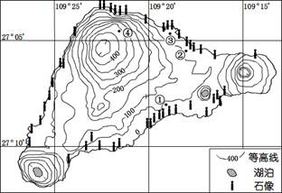 3、单选题 下左图为某岛屿的地形图。该岛海边竖立着几十尊5―10米高的石像。某年7月12日4︰20(北京时间)左右,该岛经历了一次日全食,右图为一名游客当时拍摄的照片。读图,回答问题。