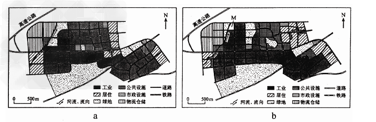 1、单选题 图a??是2005 年某城市新区规划图。针对规划实施中出现的一些问题,2010 年对原规划进行了修编(图b )。该城市盛行西北风。据此完成1 ~3 题。