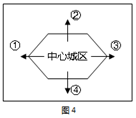 4、单选题 图4中箭头①②③④分别表示资金、技术、工业、人口流动方向,读图回答。
