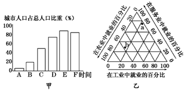 2、单选题 下面图甲为城市人口占总人口比重变化图,图乙为劳动力在各行业中的百分比图。读图,回答1—2题。