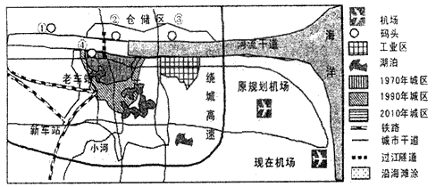 2、单选题 下图是我国某城市的形态结构图,河流的阴影部分表示受潮汐影响显著的河段,据此回答1—2题。