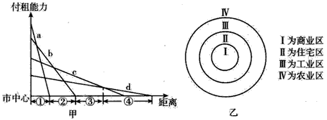 1、单选题 下图中甲为各类土地利用付租能力示意图,乙为某城市功能分区模型图(假设同一均质平面条件下)。回答1—2题。
