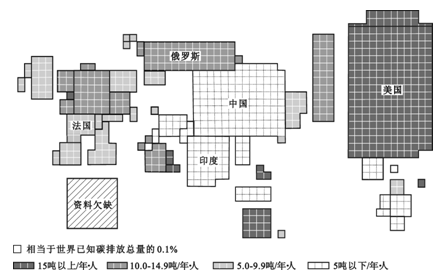 本题主要考查全球气候变暖的原因及措施等相关问题。读图分析时,应注意图中的图例类型及各自的含义,图中方块面积的大小表示碳排放总量的大小,颜色的深浅表示人均排放量的多少;此外,还应结合目前人类在应对全球气候变暖所做的努力。