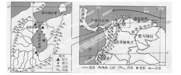 5、综合题 (28分)马拉开波湖是委内瑞拉重要的“石油湖”,湖区有7000多口油井,为了方便大吨位油轮驶入,20世纪60年代人们将连接外海的水道拓宽、挖深。马拉开波市等湖区周边城市积极发展炼油工业。根据下图,结合所学知识,完成(1)一(4)题。