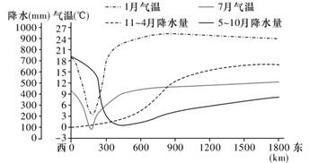 5、单选题 下图为某大陆沿纬线气温和降水变化曲线图,读图回答21~22题。