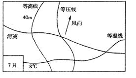 本题解析:本题考查等值线综合判读。小题1:根据风向斜穿等压线,向左偏,判断为南半球,故①错误。根据河流分布在山谷中,等高线“凸高为低”,故河流流向为西北向东南;故③正确;根据图中河流流向,图中地势西北高,东南低,故⑤错误。根据该地7月等温线为8°C,判断当地并不在热带,故没有太阳直射。故④正确。选D项。