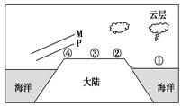 本题解析:试题分析:小题1:注意观察M、P两等压面所显示的特点是:在陆地上向上凸,海洋上向下弯曲,根据等压线要竖直方向上的弯曲规律“高凸低凹”可以判定此时陆地是高压,海洋是低压,风应该从陆地吹向海洋;再根据题上的提示“是沿北回归线所做的剖面图”可知左右方向分别表示的是西东两个方向,北半球受地转向力的影响,向右发生偏转即可以判定图中此时④地吹东南风