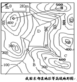 小题4:根据比例尺公式进行计算,实地距离=图上距离∶比例尺(图上距离×比例尺的倒数)=3.6×200000=720000厘米=7.2千米,G的海拔范围是(400,450),H的海拔范围是(500,550),所以G与H的相对高度为(50m-150m)。