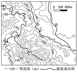 【小题1】a溪流第一断面的海拔在140—160米之间,第二个断面之间的海拔在100——120米之间,所以其落差在20—60米之间,结合选择项可知,40m符合条件,B正确。