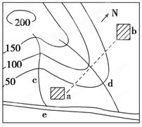 根据图中的指向标,a村在b村的正南方,A错。C小河位于山谷处,画得正确,d小河画在山脊线上,是错误的,B错。e处位于河流沿岸,用水方便,但不宜建造纸厂,因为造纸厂有污染,会污染河水,C错。从a村到b村规划的公路从施工和安全角度看不应走直线,而是应该与等压线平行,D对。