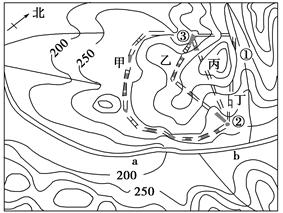 1.ab段河流流向是2.野外宿营时一般不能选择①处的主要原因是3.②处修建了水泥厂,其原料主要来自③处采石场,为了运输原料,计划修建一条公路,比较合理的线路是