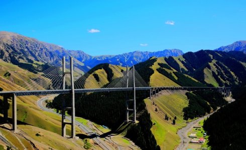 2、单选题 下图为新疆伊犁果子沟大桥景观,其拍摄时间为夏季上午10点前后,大桥附近的山都具有“阴阳脸”的特征,即山体植被一侧是草原,而另一侧是针叶林,据此完成下列小题。