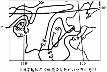 4、单选题 年径流变差系数(Cv)是用来衡量径流量年际变化的一个量,Cv值越大,径流量年际变化越大。读“中国某地区年径流变差系数(Cv)分布示意图”,判断甲地Cv值较小的主要原因是