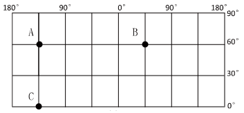 1、单选题 下图为经纬网图,AB两地、AC两地的最短距离分别是( )
