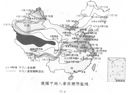 3、单选题 读图4“我国平均入春日期等值线图”,回答下题。