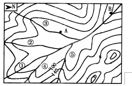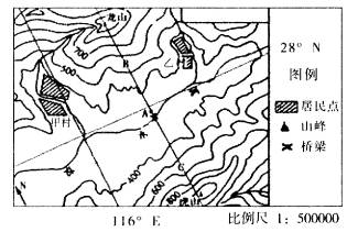 (3)该地拟建一水库,请选出大坝坝址,以“//”为图例在图中画出。筑坝前,A、B两个村庄中????????村需搬迁。