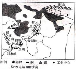 ④地处河谷地区,水流平缓,对土壤的侵蚀微弱3.图中B处在汉朝时还是水草丰美的大草原,而现在已变成一片沙漠,其人为原因是4.图示区域内甘肃、宁夏在黄河附近形成一条“工业长廊”,据信息判断该工业地带属于