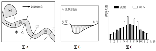 5、单选题 图A为某河段平面图,图B为图A中河流某处的河道横剖面,图C示意图A中M湖水量流入流出的月份分配。读图完成下题。